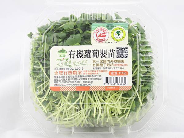 永豐有機芽菜—有機蘿蔔嬰苗有很多營養的成分喔!從有機蘿蔔嬰苗外觀看起來紫綠色的芽菜,各各排排站在透明盒子裡非常可愛,感覺每一個有機芽菜都很活躍!有機蘿蔔嬰苗具有豐富的維他命、鈣和鐵,含多量澱粉分解,維生素與胡蘿蔔素…等等,可以幫助消化、刺激腸胃蠕動,如有便祕、腸胃不好的問題,建議多吃永豐有機蘿蔔嬰苗有助於改善喔!