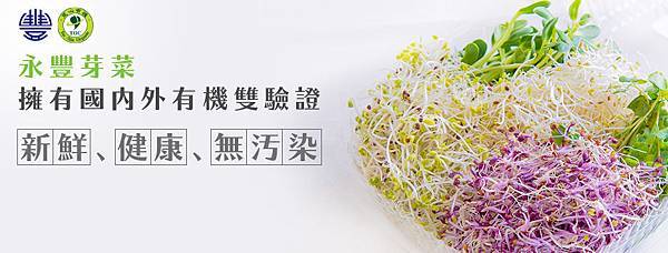 有機農業是一種不污染環境、不破壞生態,以符合生態方式種植,而永豐農場種植芽菜的水是經過過濾及殺菌後的水質,在嚴格控制溫度濕度下舒適成長,而永豐農場是國內唯一擁有國內外雙認證的有機栽培種子和芽菜合格的農場,從永豐的有機芽菜外盒都可以看到雙認證標章,因為芽菜栽培時間較短,一般種子無法透過土壤完全釋放化學農藥,但是永豐農產堅持進口成本昂貴的有機種子,經過雙認證無化學成分,讓我們吃得安心更健康!