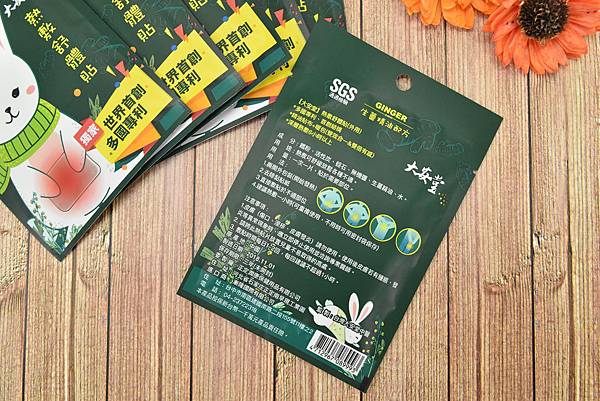 包裝背面則有熱敷舒體貼的成分介紹以及使用方式,以及適用部位示意圖如肩膀,背部,腹部以及任何肌肉痠痛不適的部位。還有SGS的合格證明。表示著熱敷舒體貼透過熱能傳導凝膠背貼裡頭的薑汁精油,滲透肌膚天天都像泡溫泉一樣。