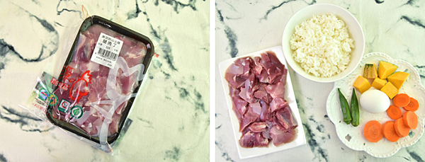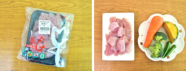 再來我們要做的第二個寵物鮮食是雞肉飯糰丸子,需要的食材有南瓜、胡蘿蔔、秋葵、雞蛋、白飯,還有野飼崎雞的腿肉丁。腿肉主要是雞肉運動的部位,加上野飼崎雞在養殖雞隻上提供給雞隻們相當寬敞的環境,所以此部位的肉質相當飽滿Q彈,能為寵物鮮食增加十分豐富的口感哦!
