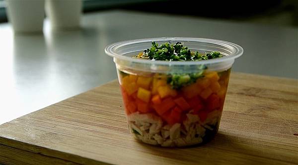2.食材放涼後,先放入秋葵、雞肉絲,接著倒入吉利丁水蓋過雞肉;再依序放入紅蘿蔔丁、南瓜丁、花椰菜碎末(每疊一層就要到一點吉利丁水覆蓋唷)