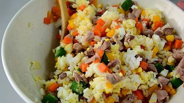 雞肉飯糰丸子的作法是先將所有食材燙熟,雞蛋煮成水煮蛋後切碎,接著將所有熟食材與白飯倒入同一碗並攪拌均勻,最後用保鮮膜或戴上塑膠將其塑形捏成團狀即可完成。