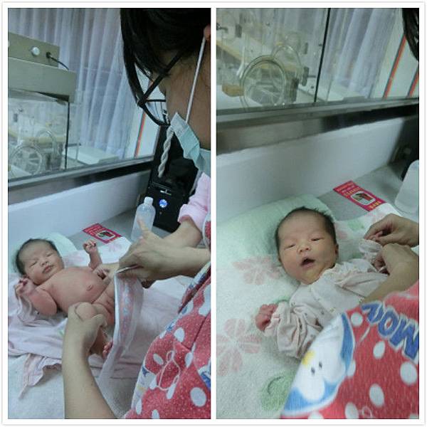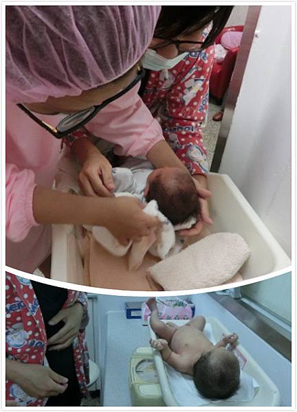 洗完頭之後把寶寶放回嬰兒床之後,怕寶寶著涼所以要趕快擦乾,護理人員說寶寶的頭部還很脆弱,擦的時候要多注意,不能太大力。之後開始準備洗身體,幫寶寶脫光之後,按照慣例先量一下體重,我家寶寶的喝奶量是整個嬰兒室中最少的,但還好在護理人員的細心照顧下,體重還是有增加,而且喝奶量也提升了許多,真的非常感謝他們呢。
